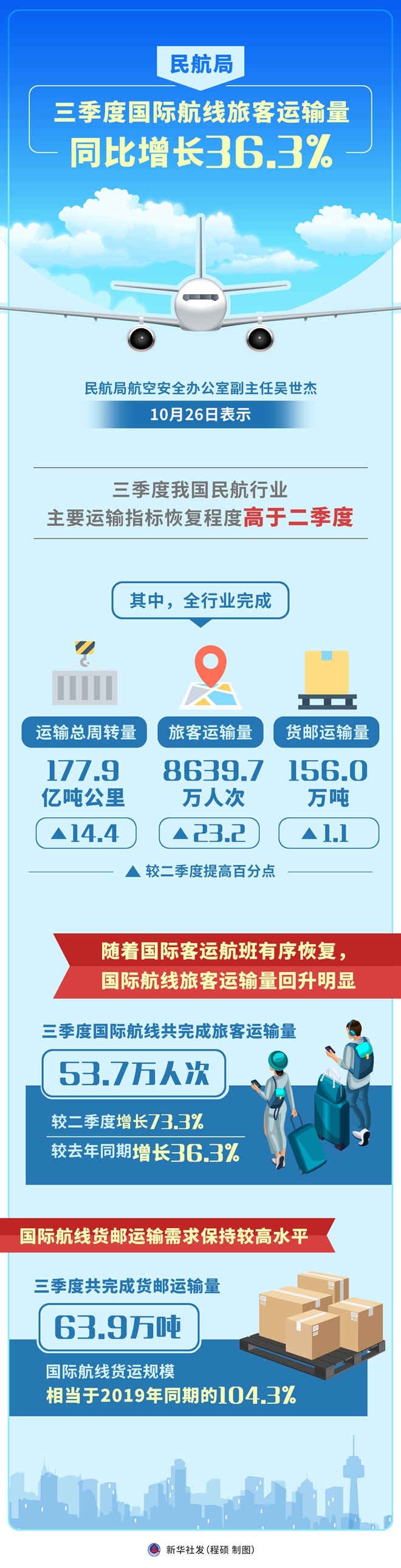 吴世杰在当日的新闻发布会上介绍,随着国际客运航班有序恢复,国际航线旅客运输量回升明显,三季度国际航线共完成旅客运输量53.7万人次,较二季度增长73.3%,较去年同期增长36.3%。国际航线货邮运输需求保持较高水平,三季度共完成货邮运输量63.9万吨,国际航线货运规模相当于2019年同期的104.3%。