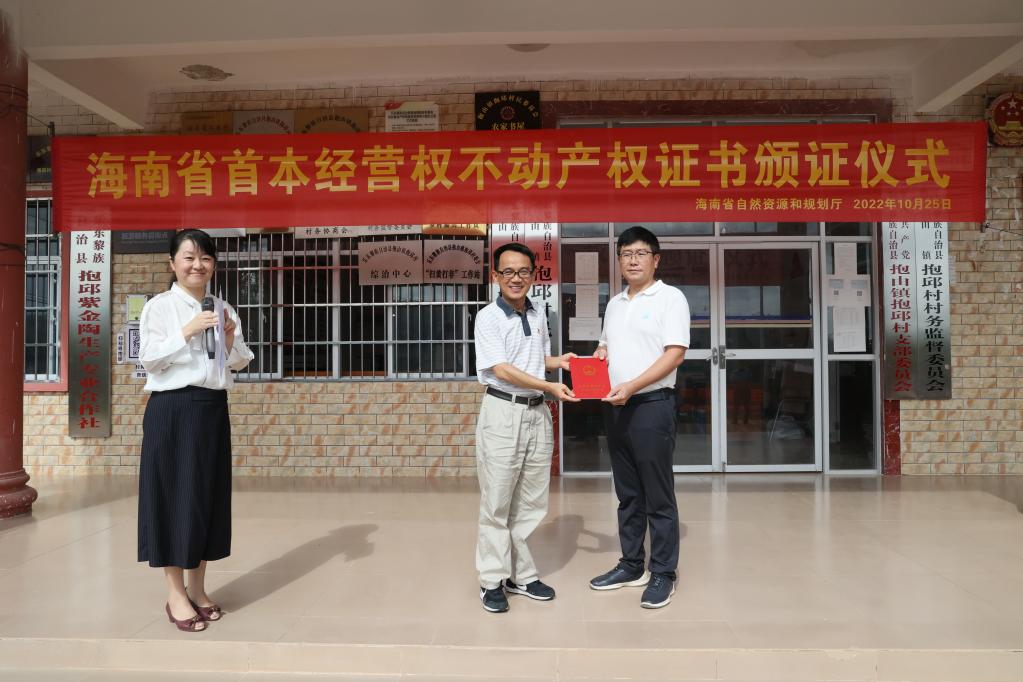10月25日,海南省首本农村土地经营权不动产权证书颁发仪式在乐东黎族自治县抱由镇抱邱村举行。 新华社记者 王存福 摄