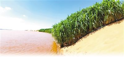 黄河内蒙古阿拉善盟段,河岸种植的菌草起到防风固沙等作用。受访者供图