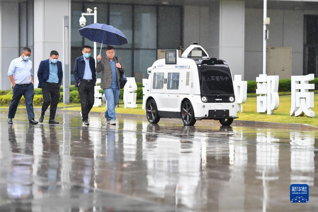 10月27日,在湖南湘江新区的湖南省检验检测特色产业园内,无人驾驶零售车从行人旁边经过。