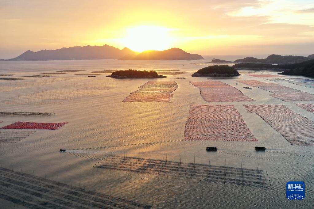 金秋时节,福建省海洋养殖大县霞浦县海域上一派繁忙的秋收景象。每天的早晨和傍晚是渔民出海劳作、归港返家的繁忙时段,渔船在广阔的海洋牧场里穿行游弋,收获紫菜、生蚝等水产品,描绘出一幅幅美丽的大海渔耕图。