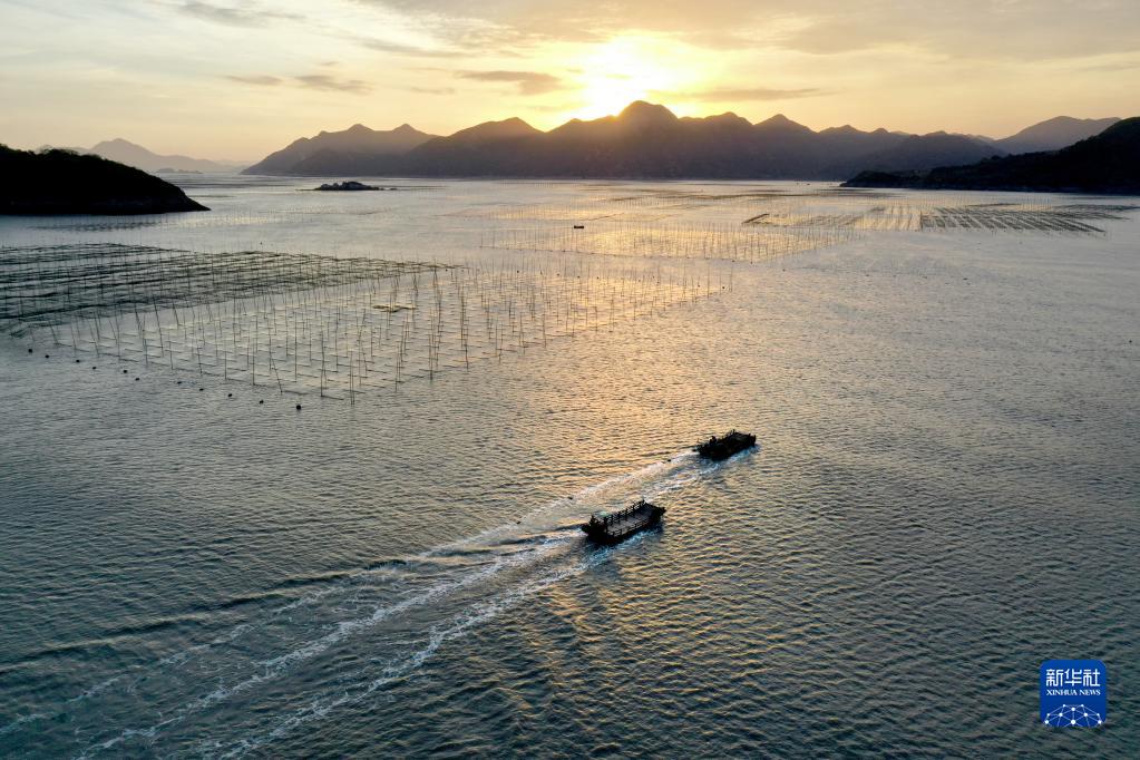 金秋时节,福建省海洋养殖大县霞浦县海域上一派繁忙的秋收景象。每天的早晨和傍晚是渔民出海劳作、归港返家的繁忙时段,渔船在广阔的海洋牧场里穿行游弋,收获紫菜、生蚝等水产品,描绘出一幅幅美丽的大海渔耕图。