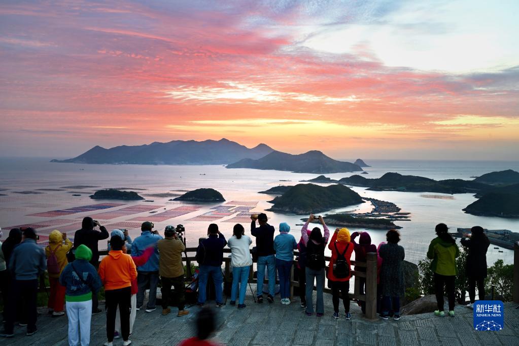 游客在福建省霞浦县三沙镇花竹村海边拍摄海上养殖区日出景观(10月26日摄)。