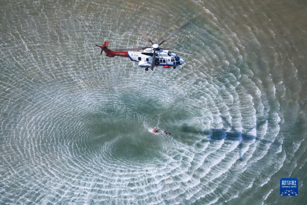 10月27日,直升机在演练海域搜救落水者(无人机照片)。