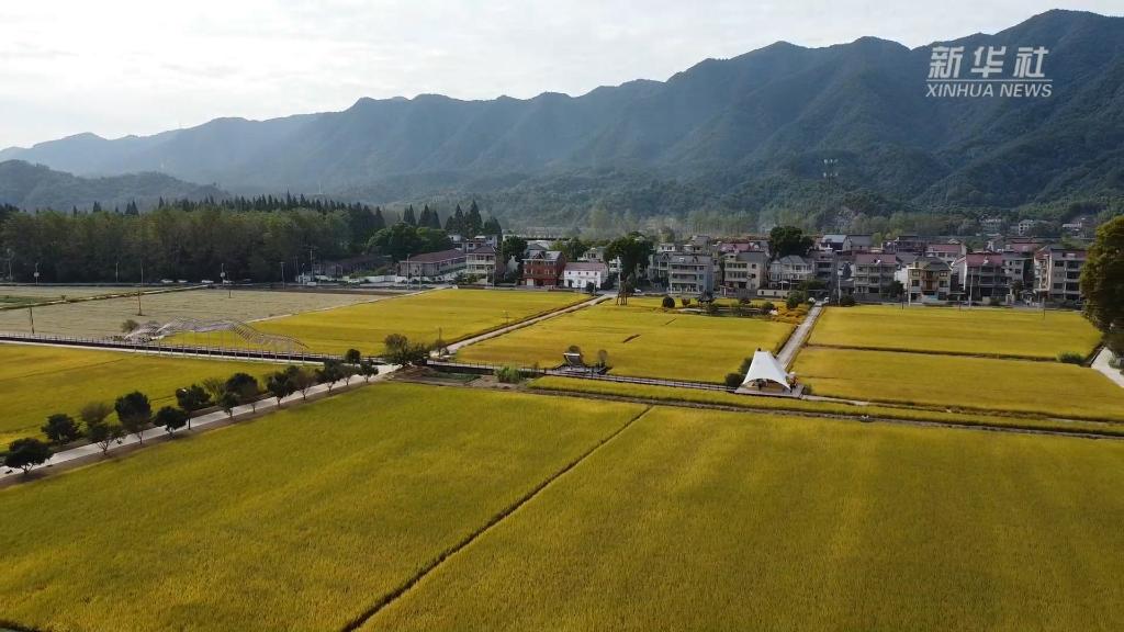 在浙江省杭州市桐庐县梅蓉村,连片的稻田依偎着富春江水,三五成群的游客尽情感受秋天的气息。
