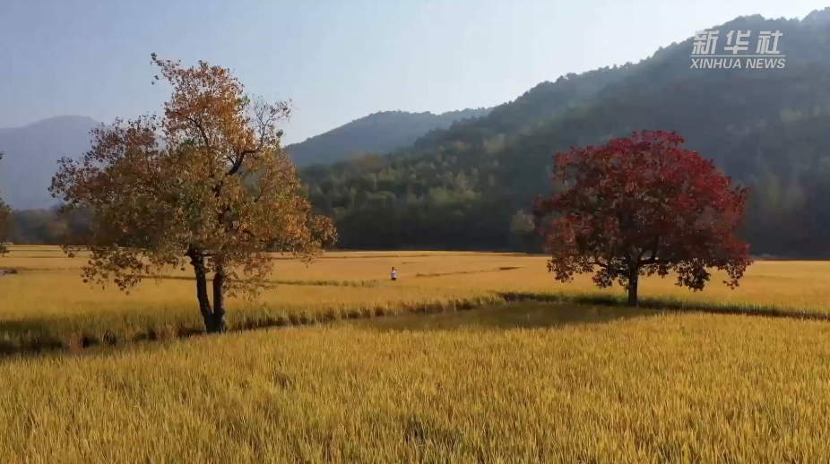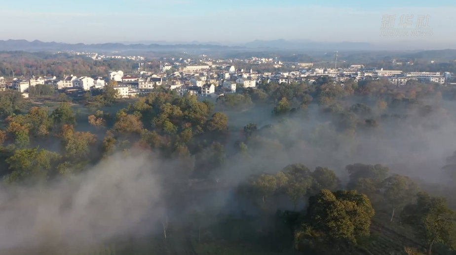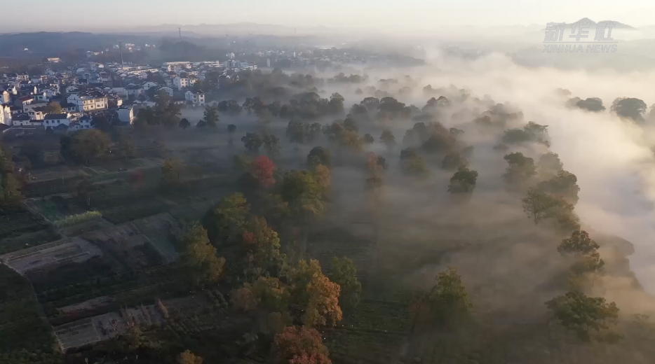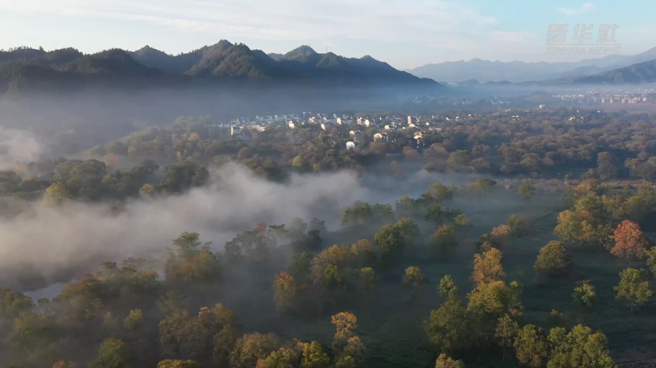 近日,秋色中的皖南山区晨雾缭绕、霜染秋叶,呈现出一幅诗情画意般的美丽秋景图。