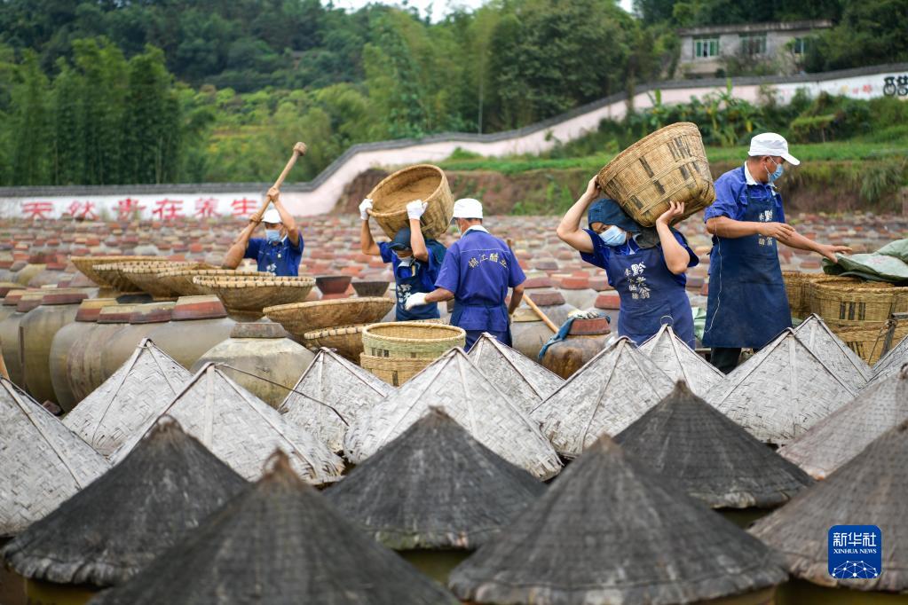 10月28日,在贵州省赤水市黔老翁醋厂晾晒区,工人在搬运制作原料。