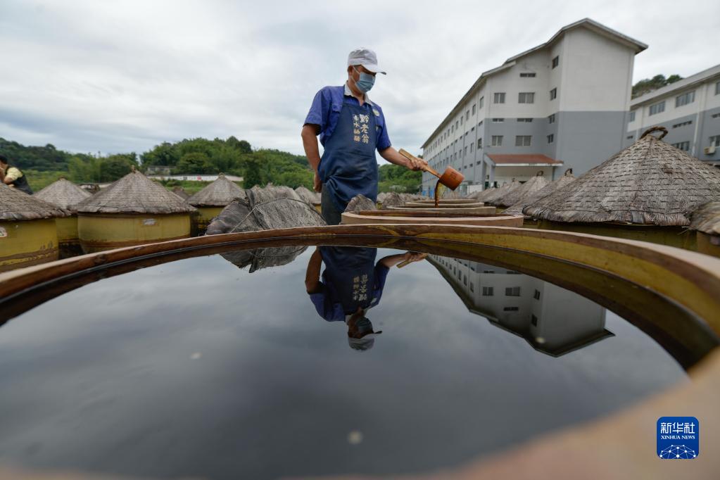 10月28日,在贵州省赤水市黔老翁醋厂,工人在晾晒区查看醋缸中的晒醋成色。