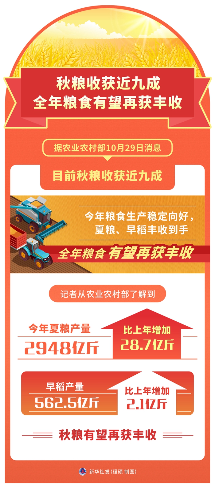 新华社北京10月29日电(记者于文静)据农业农村部29日消息,目前秋粮收获近九成。今年粮食生产稳定向好,夏粮、早稻丰收到手,全年粮食有望再获丰收。