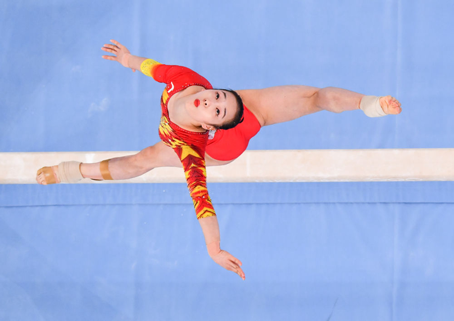 中国选手章瑾在东京奥运会女子团体平衡木项目比赛中