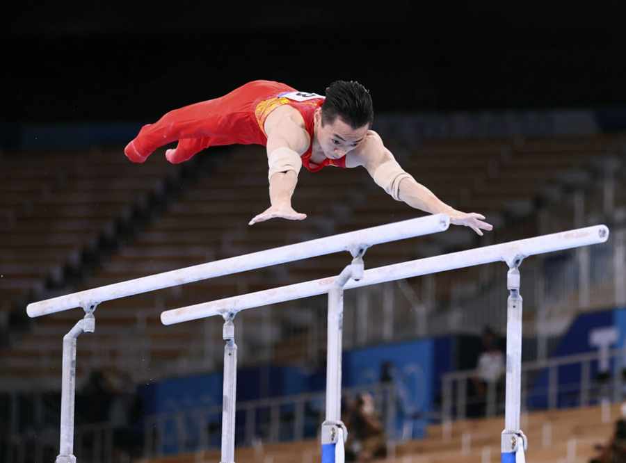 中国选手邹敬园在东京奥运会体操项目男子双杠决赛中