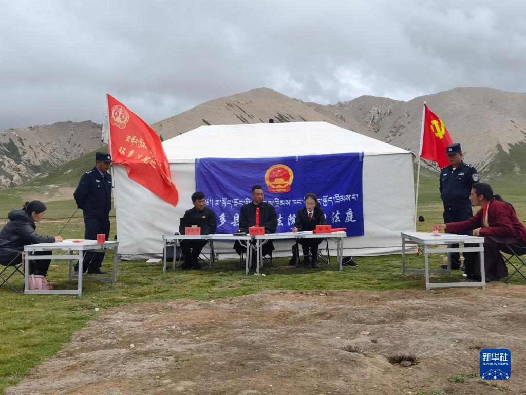 2022年7月14日,在玛多县花石峡镇,玛多县人民法院法官在审理案件。新华社发