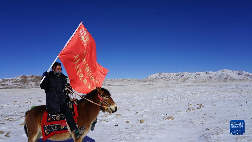 2021年12月20日,玛多县人民法院院长钱快乾骑着马,擎着“玛多法院巡回法庭”的旗子,下乡进行普法宣传。新华社发