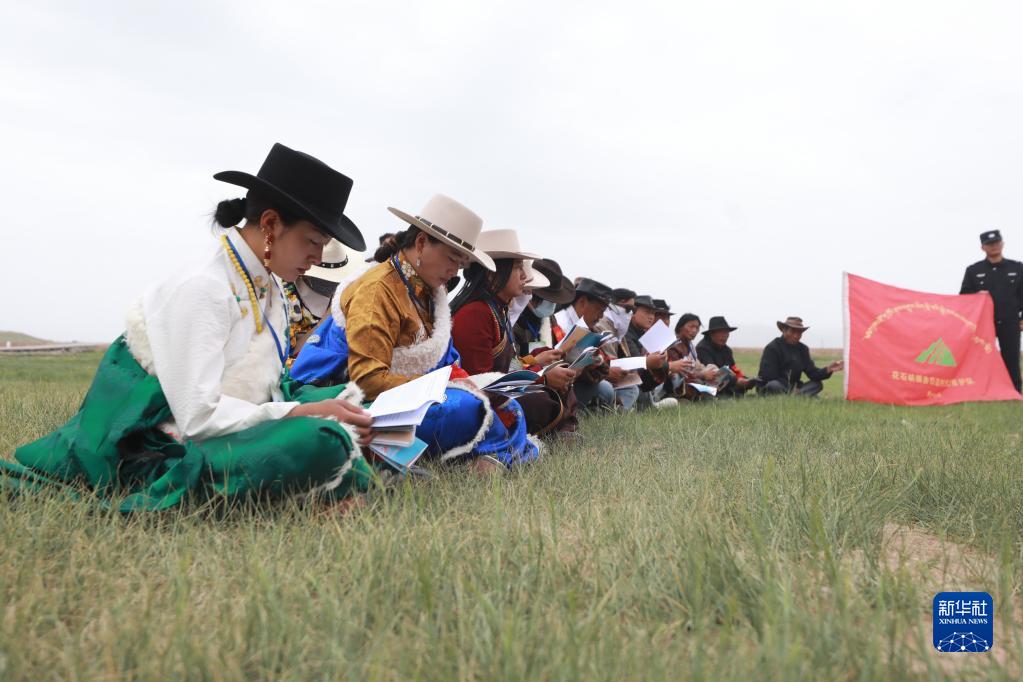 2022年7月12日,在玛多县花石峡镇吉日迈村,玛多县人民法院立案庭庭长才侦措(中)在开展环境保护相关法律宣传。新华社发