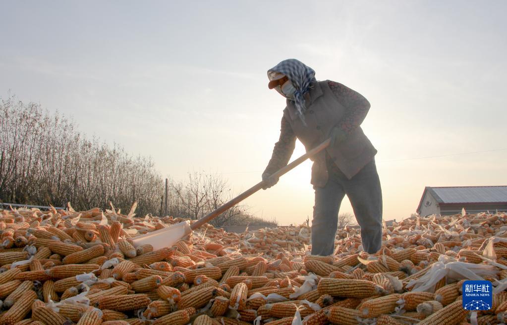 10月29日,在内蒙古通辽市科尔沁左翼中旗花吐古拉镇三家子村,一位村民晾晒玉米。