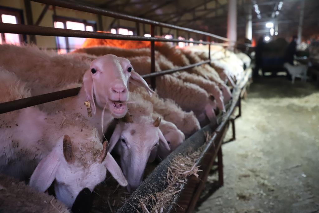 达连河村群羴盛源养殖合作社内,达连河村党支部书记武延奎在喂羊。新华社记者戴锦镕 摄
