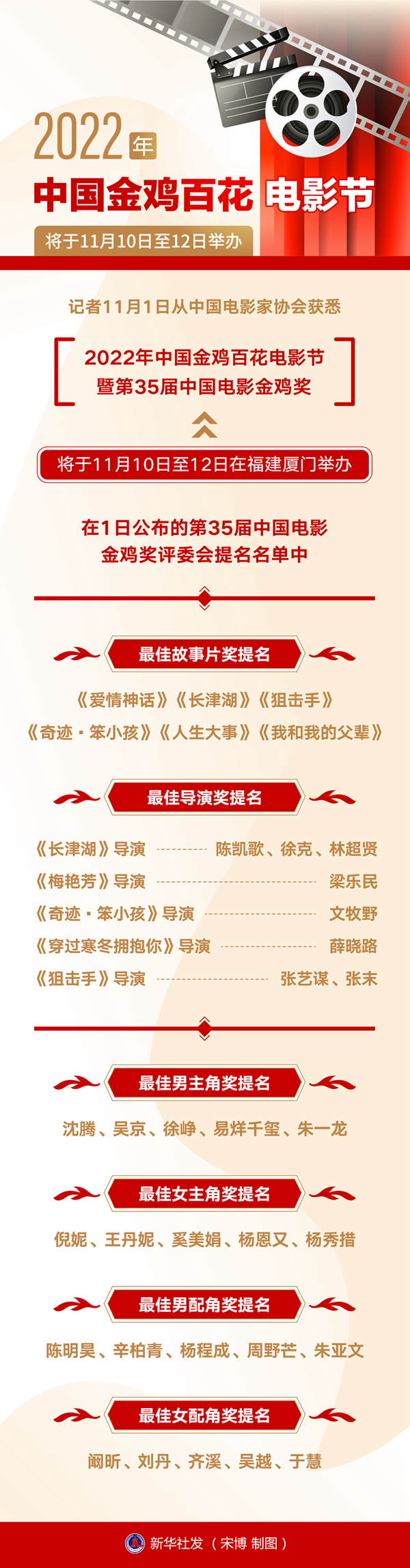 新华社北京11月1日电(记者王鹏)记者1日从中国电影家协会获悉,2022年中国金鸡百花电影节暨第35届中国电影金鸡奖将于11月10日至12日在福建厦门举办。