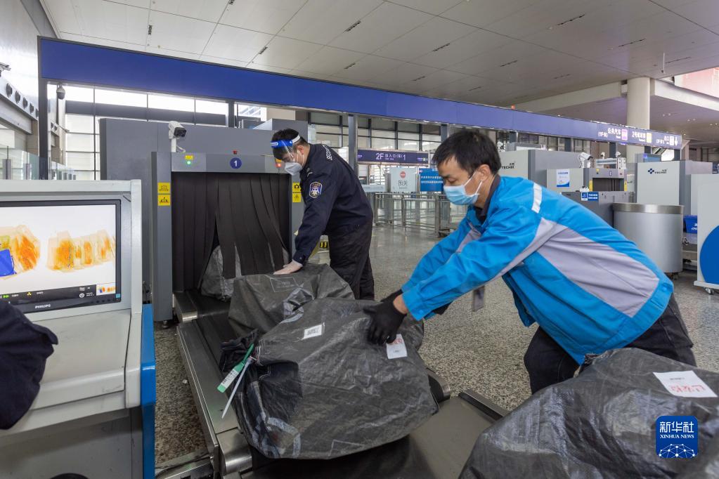 11月1日,在上海虹桥站内货物专用安检口,铁路工作人员搬运通过安检的货物。新华社记者 王翔 摄