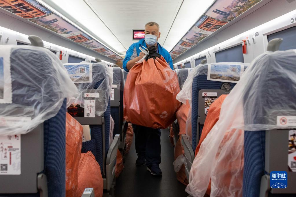 11月1日,在G1373次列车上,铁路工作人员搬运货物。新华社记者 王翔 摄