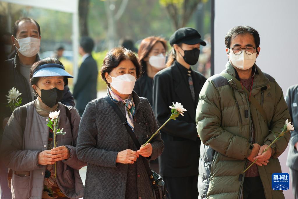 11月1日,民众走进设在韩国首尔广场首尔图书馆正门前的集体焚香所,为遇难者献花默哀。