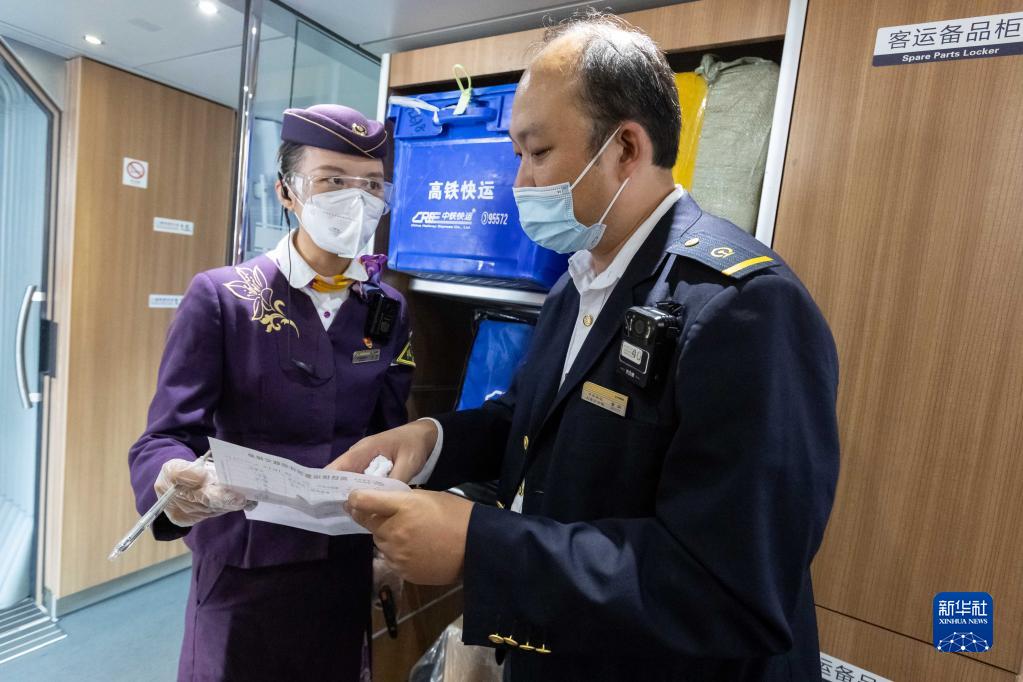 11月1日,在G1373次列车上,铁路站车工作人员交接货物清单。