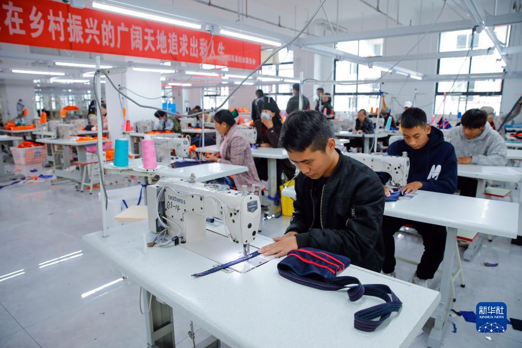 10月28日,在四川省凉山州越西县越城镇城北感恩社区附近的居家灵活就业示范基地,易地扶贫搬迁到此的居民接受缝制服装的技能培训,培训合格后,他们将在此正式上岗工作。据介绍,这里的熟练工人每天可以挣200元左右的报酬。
