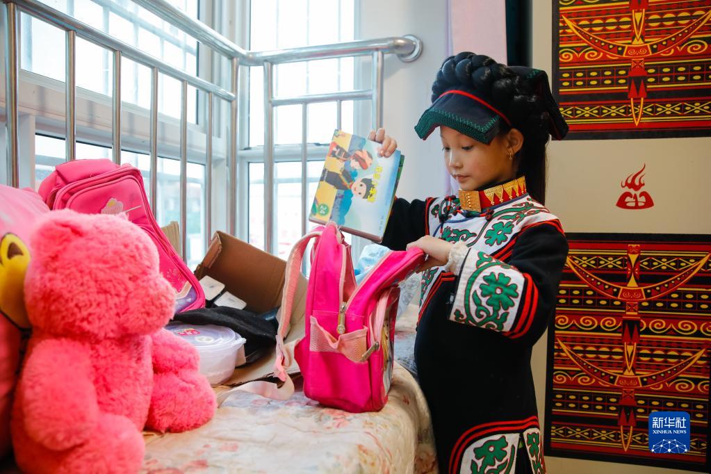 10月28日,在四川省凉山州越西县越城镇城北感恩社区,易地扶贫搬迁到此的彝族女孩王小花放学回家后整理书包。学校就在家附近,王小花上学很方便。