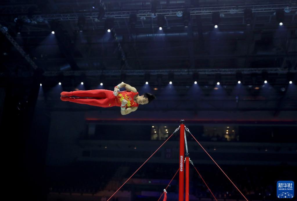 11月2日,中国队选手杨家兴在单杠比赛中。
