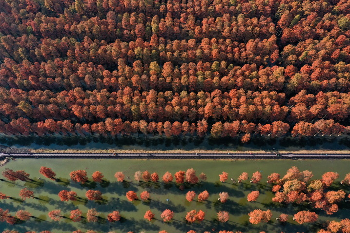 武汉涨渡湖湿地公园“水上森林”色彩斑斓。新华社发(赵军摄)