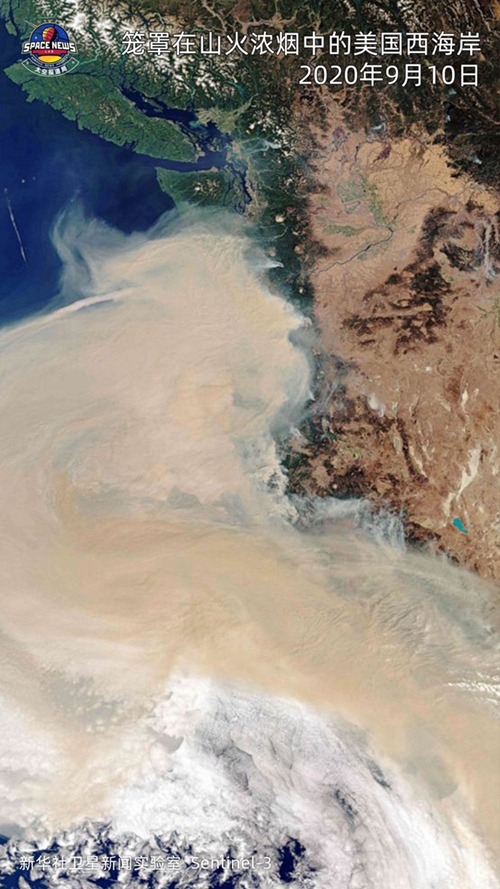2020年9月10日,欧空局Sentinel-3卫星记录下令人“窒息”的场景:山火产生的浓烟在加州、华盛顿州和俄勒冈州弥漫,并向西扩散到数千公里以外。