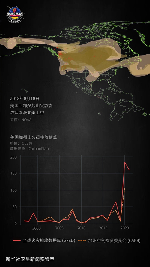利用NASA全球火灾排放数据库开发的近实时卫星监测技术,并参照加州空气资源委员会公布的野火排放数据,过去两年加州二氧化碳排放量处于近20年来最高水平。2021年,加州野火释放了1.61亿吨二氧化碳,相当于该州2020年排放清单的40%左右。