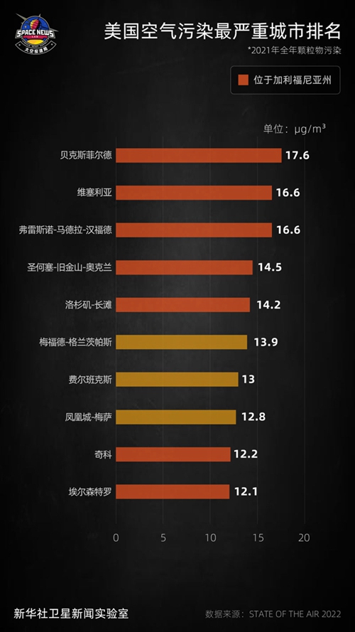 作为受山火影响最严重的州之一,加州空气污染位列第一。2021年,美国颗粒物污染最严重的5个城市均在加州。