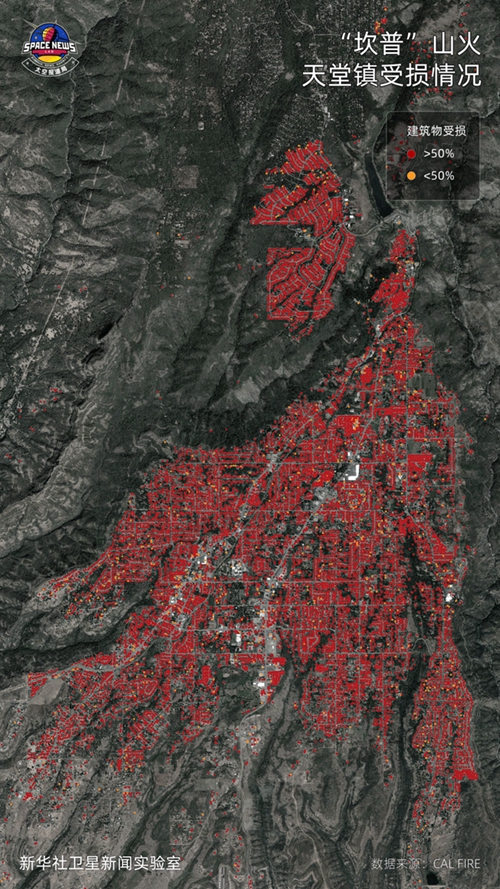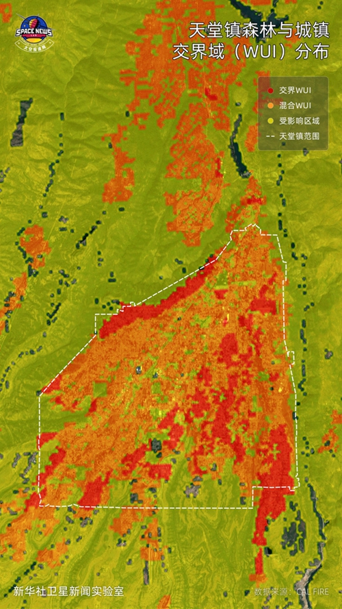 新华社卫星新闻实验室分析显示,天堂镇几乎完全处于WUI区域,其中大部分为建筑物与植被穿插的混合WUI,还有建筑物与茂密植被相邻的交界WUI。