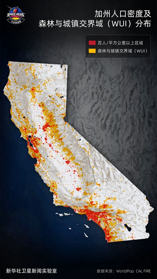 利用“新华地球”全球信息感知、分析与决策支持系统,新华社卫星新闻实验室分析了加州人口密度与WUI分布的关系:人口高密集区域与WUI区域显著重叠,林地外围少有过渡地带。