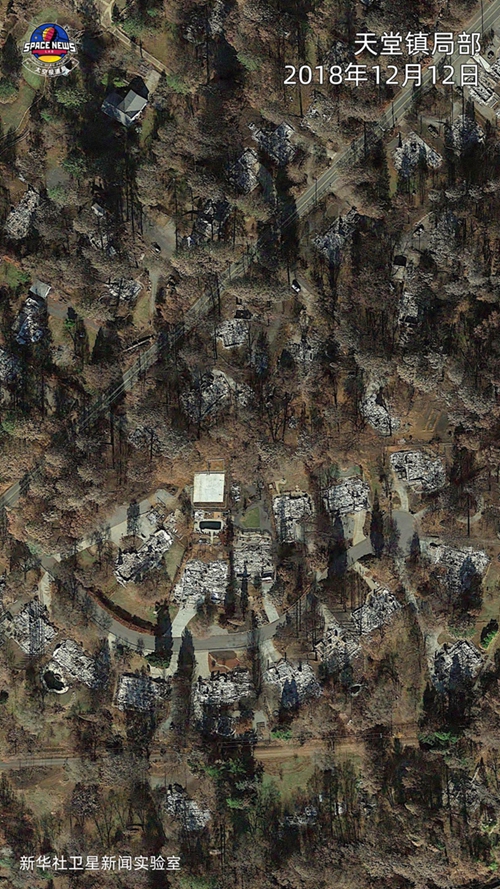 在一处被烧毁区域,卫星影像显示建筑物与林地混杂。