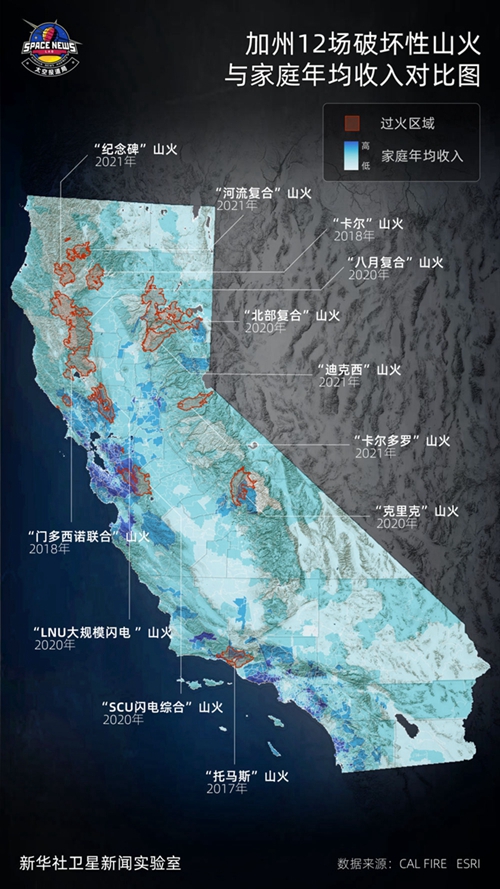 利用“新华地球”系统制作的数据图,进一步表明了山火与家庭收入之间的关系:大部分过火区域居民为中等收入家庭。火灾没有蔓延到低收入家庭为主的区域,主要原因是低收入者大多居住在城市以及平原上的老城镇,根本无力在山林边建造独立住宅。