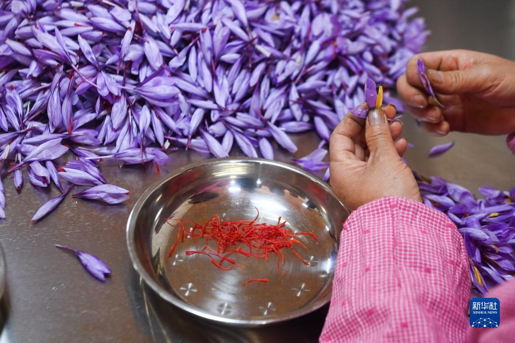 11月4日,在建德市三都镇圣江村的西红花基地里,农户们在从收获的西红花里抽出花丝。