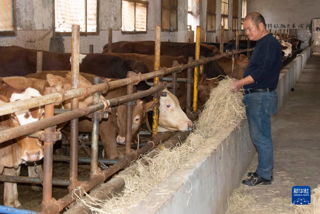 11月4日,湖南省湘潭市湘潭县河口镇华中村村民用回收的秸秆喂牛。