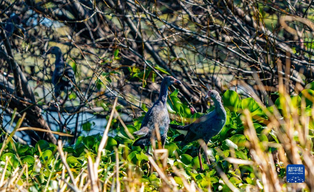 在湿地觅食的紫水鸡(10月28日摄)。