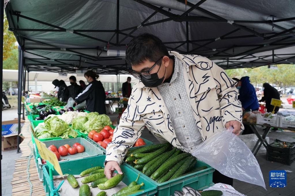在金隅·山樾嘉园小区,北京科技大学应届毕业生石全在小区内的便民菜站选购蔬菜(10月23日摄)。