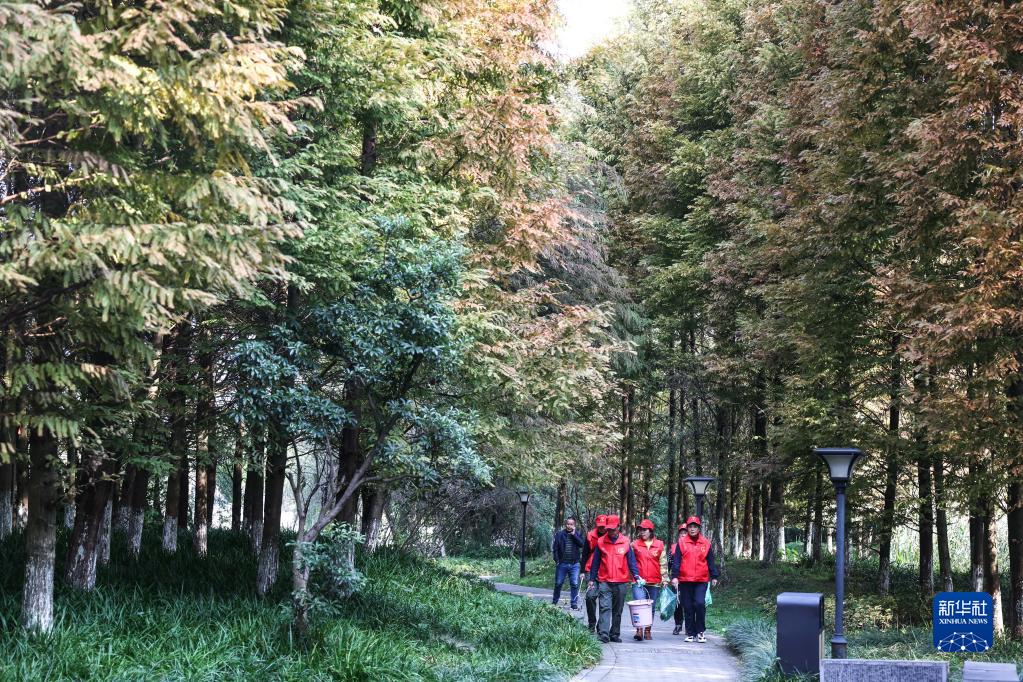 11月4日,在贵州贵阳,周余庆(右一)与志愿者一起在花溪国家城市湿地公园内巡查。