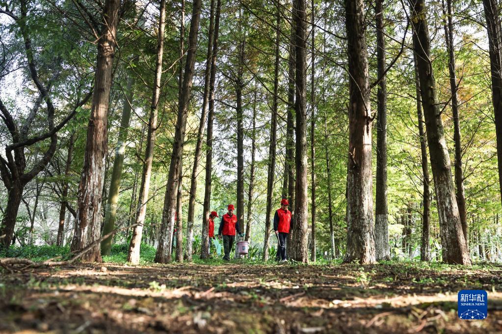 11月4日,在贵州贵阳,周余庆(右一)与志愿者一起在花溪国家城市湿地公园内巡查。