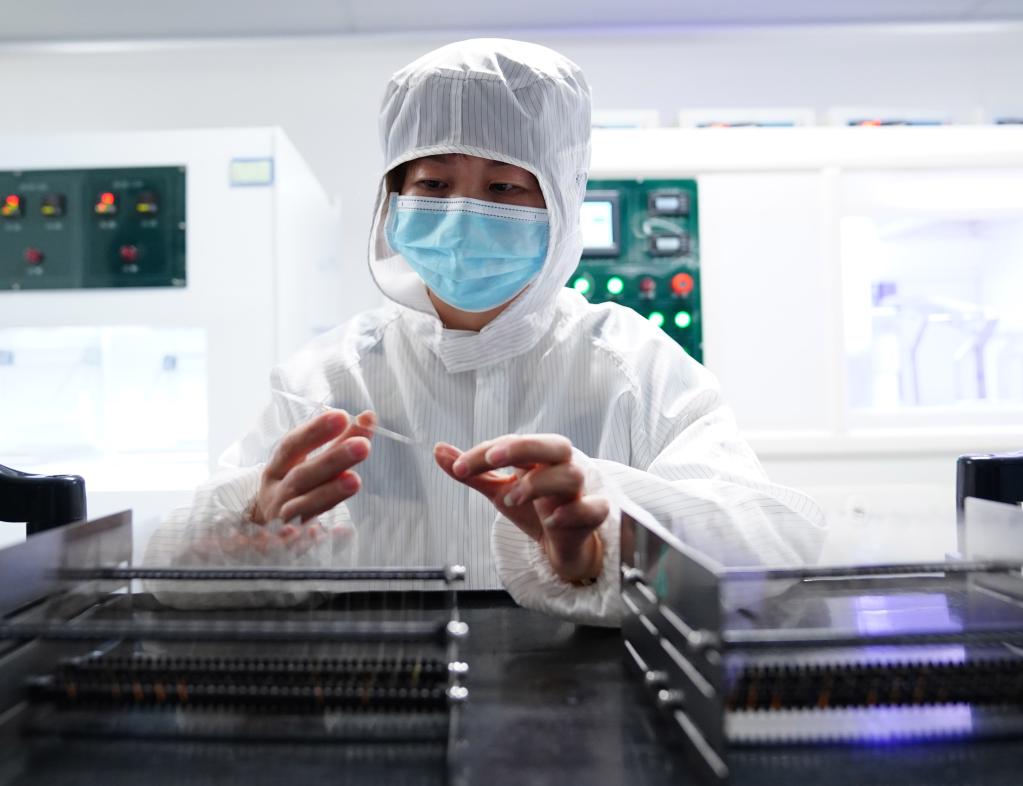 技术人员弯折一片轻量化柔性抗辐照玻璃盖片,展示其柔韧性