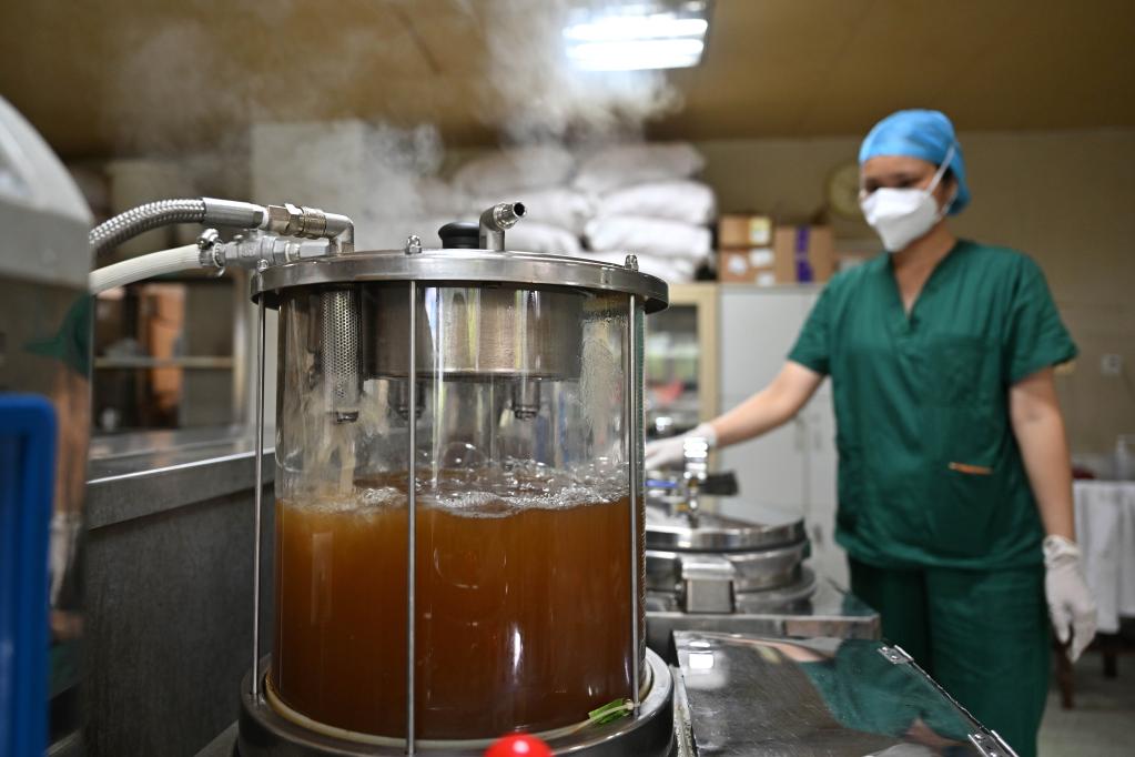 2022年8月20日,工作人员在海南省三亚市中医院煎煮中药,助力海南抗疫。新华社记者 郭程 摄