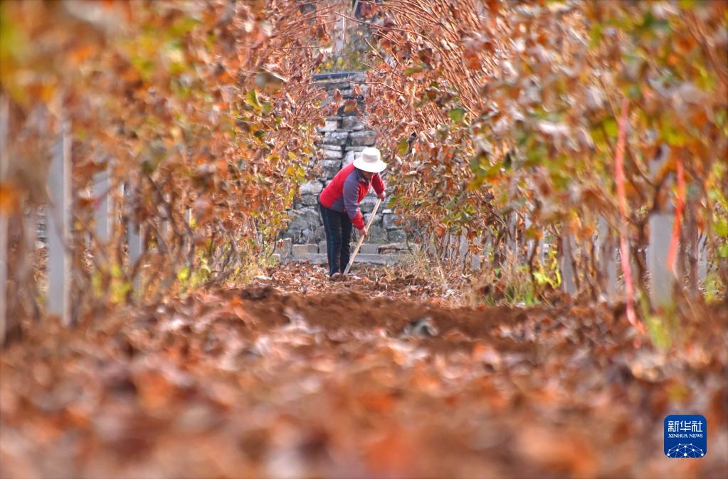 11月7日,山东省淄博市沂源县悦庄镇下龙巷村农民在葡萄田间劳作。