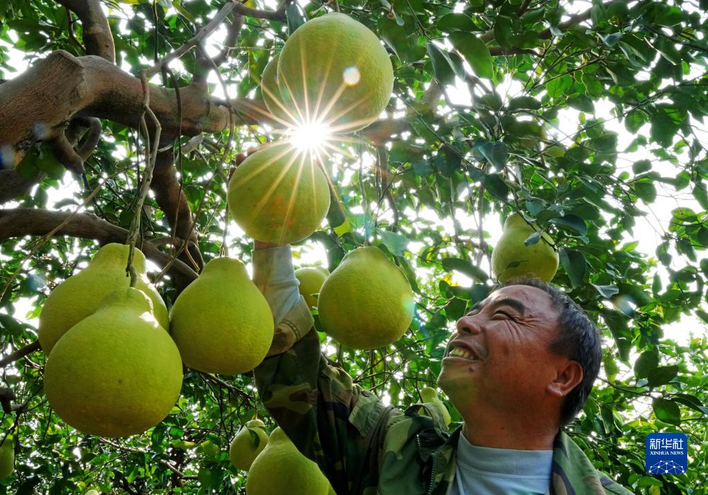 11月7日,在广西融水苗族自治县国营贝江河林场柚子园,一名果农在采摘糯米柚。