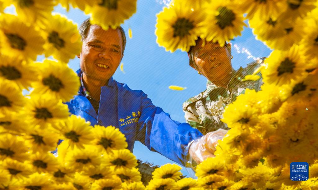 11月7日,江西省新余市仙女湖区易家桥村农户在加工金丝皇菊。