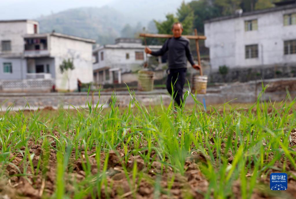 11月7日,贵州省遵义市正安县安场镇胜利社区农民在田间管护麦苗。