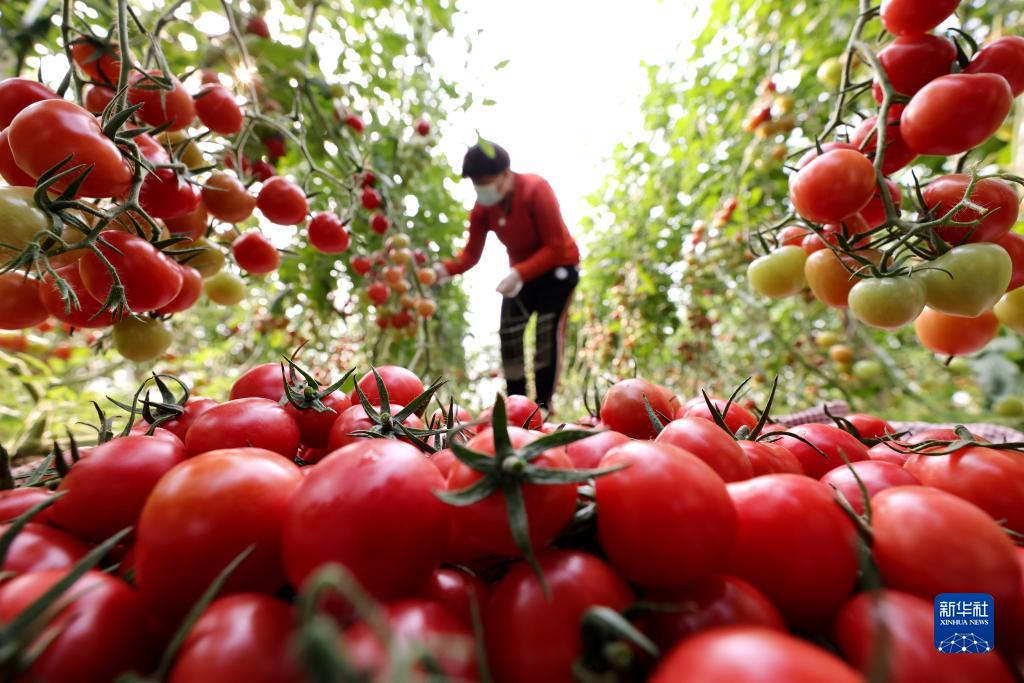 11月7日,山东省枣庄市市中区一合作社的农民在大棚内采摘小西红柿。