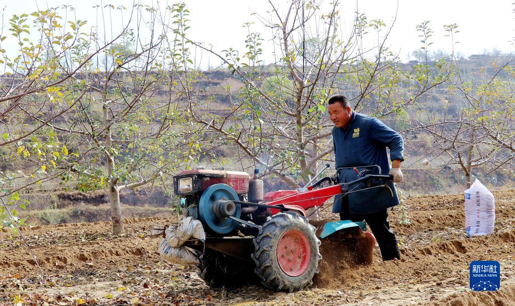11月7日,在甘肃省平凉市静宁县威戎镇杨湾村,果农在果园里驾驶农机开沟施肥。